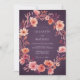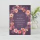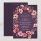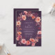 Uma encantadora grinalda de flores de pêssego e coral adorna este design. Elementos florais delicados criam um clima romântico e pictórico com um fundo de ameixa profundo. Evoca uma atmosfera quente e etérea para uma ocasião especial.