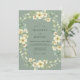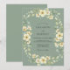 Uma grinalda terna de flores amarelas macias e folhas verdes delicadas envolve o centro. Este design evoca uma sensação de elegância natural e romance sutil, perfeito para uma ocasião serena. A paleta de cores suaves cria uma atmosfera calmante e convidativa.