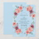Uma delicada grinalda de coral e profundas flores de rosa adorna um suave fundo azul celeste. Este design romântico evoca uma sensação de elegante suavidade, perfeito para uma reunião ao ar livre caprichosa. As flores em estilo aquarela apresentam pétalas suaves e folhagens sutis.