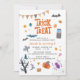 Mande os convites assustadores para uma festa de aniversário assustadora com o nosso truque ou trate convites de aniversário especiais de Halloween. O texto "Trick or Tratat" é definido enquanto o resto do texto pode ser facilmente alterado quando você clica no botão "Personalizar" acima. Este convite de aniversário de Halloween apresenta jack-o-lanternas de aquarela, morcegos, monstro de Frankenstein, aranha, fantasmas, um gato azul, uma árvore sem folhas, teia de berço e muito mais. Perfeito para crianças festas de aniversário de Halloween e outros eventos temáticos de Halloween que você planejou para o outono. DICA: Veja os outros itens do Dia das Bruxas, como as placas de papel, bolsas de favor, copos de papel, etc. feitos com este design se você quiser suprimentos de festas correspondentes para a festa de aniversário na coleção abaixo