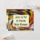 Vá brilhante e vibrante com este convite para o chá de fraldas. O fundo é uma vibrante espiral de cor na frente e no verso. Um quadrado na frente e um banner na parte traseira permitem que você tenha muito espaço para personalizar com seus detalhes de chá de fraldas.