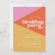 Convites de festas de aniversários brilhantes e coloridos com letras retrorestiais e uma paleta cor rosa, laranja e amarela. Personalizar com qualquer idade. Convites relaxados e divertidos para aniversários retrortemáticos.