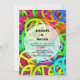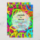 Um convite de casamento com uma vibração de sessenta anos. Sinais legal de paz em néon brilhante e vibrante com todas as cores do arco-íris.