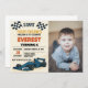 Comece seus motores! Celebre o grande dia do seu filho em alta velocidade com este excitante Convite de Aniversário Race Cars, desenhado para rapazes que adoram velocidade, carros e competição. Apresentando carros de corrida ousados, padrões de bandeira checados e cores vibrantes, vermelhas e azuis, este convite captura a emoção de uma celebração de dia de corrida.