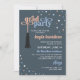 Convide seus amigos e parentes para uma festa celebrando sua filha se formando com este convite de festas de formando retrô bonito em cinzas de aço com uma combinação retrorcolorida de azul de aço, branco e areia com um punho pendurado em um arco amarrado na curva do g. Convite à festa de formatura retrô com um roteiro fofo, estrelas e explosões, e uma fita. Personalize com uma foto da sua filha atrás.