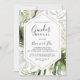 Esse convite de festas verde-tropical de ouro geométrico que revela ser perfeito para um gênero de bebê moderno revelar. O design apresenta ouro de aquarela pintada à mão e palmeiras verdes e folhas de bananeiras com flores cor-de-rosa amontoadas em buquês, enfeitando um quadro geométrico.