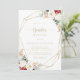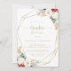 Este convite de festas geométrico clássico de ouro floral revela que é perfeito para um gênero de bebê rústico. A design apresenta a cor-de-água, flores brancas, borrifadas e douradas e bagas com folhagem verde dispostas em buquês elegantes.