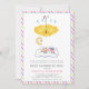 Guarda-chuva amarela e chá de bebê dormindo por correio, apresentando uma menina adormecida numa nuvem, uma lua crescente e uma estrela sobre ela e um guarda-chuva amarelo com gotas de água. À sua volta há uma borda com faixas diagonais cor-de-rosa e amarelas e as mesmas faixas cobrir atrás. Alguns elementos de Trina Clark e cortesia de vectorportal.com.