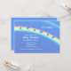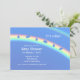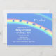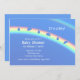 Um chá de fraldas com guarda-chuva e cai num arco-íris num fundo azul. O texto de exemplo personalizável está pronto para ser editado com seus próprios detalhes.