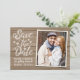 Anuncie o seu casamento com este cartão com fotos apressado "Salve a Data". Caligrafia feita à mão branca com corações pintados em madeira com sua foto ao lado. Altere o nome, a data e o local e envie-o para o envelope complementar ou um envelope simples (adquira separadamente).