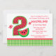 O design bonito do segundo aniversário com um número dois vermelho grande encheu-se com as sementes da melancia, uma fatia de melancia e as flores pequenas. Beira do guingão. Texto customizável. Original de PinkInkArt!