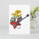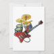 Uma guitarra elétrica em vermelho com um tambor atrás dela. Esta design parece realmente eficaz neste Convite