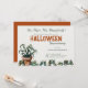 Um convite divertido, mas elegante, para a festa do Dia das Bruxas com um lar/mudamos de tema, com uma planta e casa de Halloween e uma fileira de calçados gremlin, em aquarela. Elegante, moderno, simples e divertido, vai colocar um sorriso nos rostos dos seus convidados.