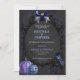Um convite preto elegante e assustador, roxo e azul com raven, abóboras e esqueletos dançantes nas costas.