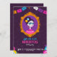 Um convite para o dia dos mortos. Convite com um retrato de uma morto e com cores e bandeiras mexicanas no estilo de desenho animado.