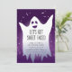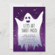 Este convite de diversão assustadora apresenta um conjunto fantasma num fundo roxo. As palavras "Vamos Get Sheet Faced" são escritas em uma fonte divertida. É a maneira perfeita de convidar seus amigos para uma festa de Halloween onde eles podem vir vestidos com seus trajes e se divertir com folhas.