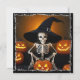 Convites de festas de Halloween assustadoras. Esqueleto assustador com chapéu de bruxa com macaco-o-lanternas.