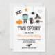 Dois Spooky! Convite de festas de segundo aniversário de Halloween. Uma festa de aniversário manchada, convidada com bruxa fofa, gato, abóbora e frankenstein.