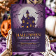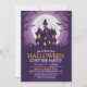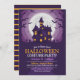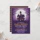 Aproveite este convite de casa assombrado do Halloween perfeito para qualquer festa de Halloween, festa ou aniversário! Ele apresenta uma paisagem caseira assombrada e um esquema de cor roxo e laranja.