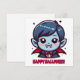Ce design présente un charmant petit vampire aux traits stylisés et enfantins, parfait pour célébrer l’esprit d’Halloween. Le personnage arbore une peau bleutée avec des nuances subtiles et des joues rosées, évoquant une innocence juvénile. Ses yeux grands et expressifs sont accompagnés de petites étoiles scintillantes, ajoutant une touche magique à l’ensemble. La coiffure du vampire est d’un bleu profond avec des reflets plus clairs, ce qui crée un contraste agréable avec le teint de sa peau. Il porte un costume classique de vampire composé d’une cape rouge vif doublée de noir et d’un nœud papillon rouge à pois blancs, ce qui lui donne un air à la fois élégant et festif. Les canines proéminentes du sourire espiègle rappellent son identité vampirique tout en conservant une allure adorable et accessible. Le texte “Happy Halloween” en lettres arrondies et amicales surplombe le personnage, renforçant le thème festif avec une typographie qui évoque la convivialité et la joie des célébrations d’Halloween.