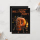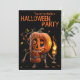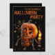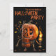 Uma abóbora engraçada e engraçada jack-o-lanterna na forma da letra "P" segurando uma lâmpada com uma chama.