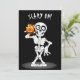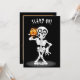 Esqueleto de Dia de as Bruxas engraçado segurando uma abóbora inflamável sobre um fundo preto. A cor de fundo pode ser alterada. O texto é editável.
