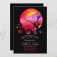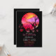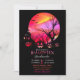 Jack-o-lanternas, árvore morto e casa assombrada iluminada por uma lua de cheio brilhante em preto, rosa quente e laranja para um convite assustador para o Dia das Bruxas.