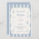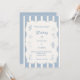 A hand drawn style wedding invitation with beach, coastal theme. A soft ivory and dusty blue striped colored background, with an ivory frame and dusty coastal blue elements. Personalize and add your names and the details.