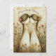 Cute wedding invitation for Lesbian couple. Two hand drawn brides holding hands stand side by side in a pink rose garden. They have long brown braids and pink roses in their hair, adorable pencil drawing for your special day.