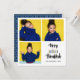 Cartão de saudação Festivo Hanukkah Holiday com três fotos pessoais e "feliz hanukkah" em tipografia de pincel escrita à mão e velas em tons de blues e amarelos. Personalize o texto personalizado com seu nome e ano. Cartões invertidos a um padrão de estrelas brancas e amarelas sobre fundo azul coordenado.