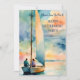 A Happy Retirement Party Invitation designed with a watercolor sailboat theme in shades of blue, orange and turquoise. The front text includes: Please Join us For A, Happy Retirement Party, on a background of a couple sailing into the sunset. The reverse text includes: Honoring, The Couple's Names, The Date, Time, Location, Address and RSVP Details. To personalize, simply insert your text into our easy template, replacing the sample.
