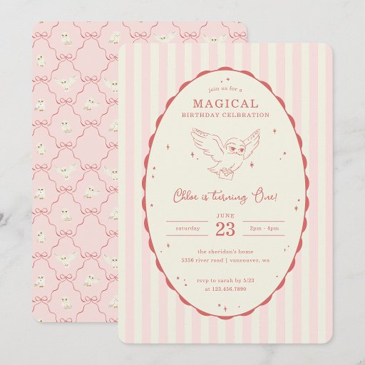 Invite guests to a magical celebration with this enchanting Harry Potter Hedwig birthday design. Featuring Hedwig soaring gracefully with a letter in her beak, this sweet and whimsical layout is framed inside a scalloped oval with delicate star accents for a touch of Wizarding World charm. Soft pink and cream vertical stripes create a timeless backdrop, while coordinating details on the reverse showcase a repeating Hedwig and bow pattern for an extra magical finish.
