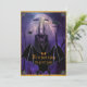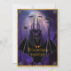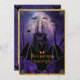 Um convite legal e assustador para o Dia das Bruxas roxo, com um castelo assustador assombrado, aranhas e teias de sopa, ravens negros assustadores e um morcego voador gigante. Atrás deles está uma lua de cheio brilhante. A parte de trás da carta apresenta os detalhes personalizados do hospedeiro com mais morcegos, aranhas, corvos-marinhos, ratos e uma versão menor do castelo assombrado, todos sobre um fundo de veludo roxo e luxuoso.