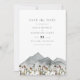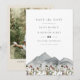 Este casamento salva o cartão de data com montanhas de cores aquáticas boho e flores silvestres coloridas com um design simples e minimalista. Este é o convite perfeito para uma celebração de casamento de primavera ou outono. Edite facilmente a maioria dos textos e mude a foto na parte de trás para seu toque pessoal.