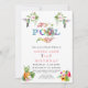 Design elegante e único com tipografia "É uma festa de piscina", onde a letra O foi substituída por frutas florais e arranjos de bebidas, flores tropicais exóticas hibiscus, folhas de palma, eucalipto e beija-flores, frutas tropicais, sorvetes, bebidas, como itens de piscina. Use a ferramenta Personalizar para adicionar suas informações. Para obter itens correspondentes, visite minha Coleção de Aniversário Tropical.