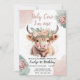 Create a soft and stylish first birthday celebration with these highland cow birthday invitations designed for little girls. Featuring a fluffy watercolor cow with a delicate floral crown, this design blends boho charm with a modern farmhouse feel in blush pink, cream and sage green tones.