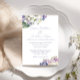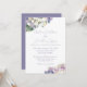 Este convite romântico de casamento floral apresenta ídrangas brancas e roxas de aquarela. Um delicado buquê de flores de hydrangea é ilustrado no topo, e outro no fundo.