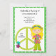 Comece a comemorar com este adorável convite de aniversário hippie das meninas. ele tem um grande sinal de paz de verde limão com flores coloridas ao seu lado. Ao lado dele está uma garota fofa de cabelo comprido. Ela tem uma camisa de tingimento colorida com banda de ouvido correspondente. Há uma borda verde com bolinhas brancas ao redor de um centro branco. Veja os muitos outros designs e produtos desta linha. ©JW Ilustrations