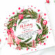 Holiday Brunch Elegante Christmas Floral Wreath Invances apresenta uma coroa floral de na moda com presentes de Natal, canetas doces, decorações e sinos em verde e rosa sobre fundo branco. Dentro a coroa adicione suas informações personalizadas para seus Convites de festas de Natal. Basta editar o texto nas caixas de texto fornecidas. Elaborado por ©Evco Holidays www.zazzle.com/store/evcoholidays