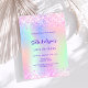 Um convite de aniversário 18º feminino e feminino. Na frente: Um arco-íris, fundo holográfico colorido em roxo, rosa, verde-menta. Decorado com faíscas rosadas. Personalize e adicione um nome e detalhes da parte. O nome é escrito com um script de estilo manuscrito, letras cor roxa.