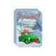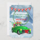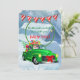 Um Convite de festas de Natal brilhante e cerejoso com um caminhão-safra carregado com a árvore de Natal da família e decorações de férias para terminar