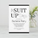 Convite de solteiro personalizado em preto e branco. Design moderno com uma ilustração de gravata arco e a citação "é hora de se adequar". Personalize-o com os detalhes do seu partido e informações de RSVP.