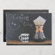 Café tematizado se junta / convite de festas. Um quadro atrás diz "tempo do café" com um smiley face, escrito em giz. Na frente, em uma mesa de madeira rústica, há uma caneca de café com um padrão de diamante design a preto e branco. Sentado ao lado da xícara de café está um pote de café com um filtro grande e um pote de café recém-fabricado. Parece rústico e antiquado. A parte de trás do convite é personalizável para você colocar todos os detalhes de sua festa, em um design de textura de quadro.