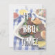 Convide familiares e amigos para uma festa de churrasco no quintal de verão com este convite fofo. Hambúrgueres frescos, ketchup, mostarda, shiskebobs fora da grelha. Fundo da mesa azul e branco com verificação. Personalizável com o seu texto. Uma forma excelente de celebrar um quarto da festa de julho, um reencontro familiar ou um piquenique de aniversário divertido!