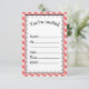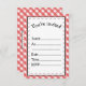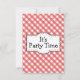O fundo da frente e do verso é um padrão de gingham vermelho. A frente tem modelos de texto para adicionar seu próprio texto ou pronto como está. Todo texto está em preto, mas pode ser personalizado para sua própria cor e fonte. No verso há uma etiqueta branca com uma modelo de texto a ler "It's Party Time" em letras negras.
