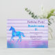 Um convite de aniversário com um bonito cavalo aquarela em cores azul e roxo. Correndo selvagem e livre. Colocado sobre um fundo listrado roxo com um talo de vintage. Uma borda de aquarela azul e rosa colocada na parte inferior.