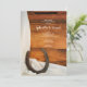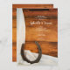 Convide convidados para que a festa continue na manhã seguinte à cerimônia de casamento com o Posto Brunch, informal mas elegante, Horsfere e Satin Country. Este temático cômico costume equino Após o Café da Manhã de Casamento ou o Convite de Luncheon apresenta uma fotografia escura de uma ferradura ocidental enferrujada e uma cebola branca com um fundo de madeira marrom-curvada. Inpo perfeito ou ideia para um evento casual de festas do tipo rancho para uma noiva de vaquinha e um noivo de vaqueiro.