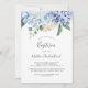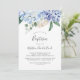 Este elegante convite de batismo branco com hortênsia azul é perfeito para um batismo de bebê na primavera ou no verão. O design floral clássico apresenta hortênsias de aquarela azul suave acentuadas com flores cor-de-rosa neutras e folhas verdes.