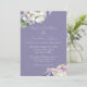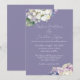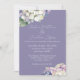 Este convite de casamento floral romântico apresenta hortênsias roxas e brancas em aquarela sobre um fundo roxo lavanda empoeirado. Um delicado buquê de flores de hortênsia é retratado na parte superior e outro na parte inferior.
