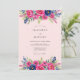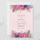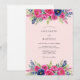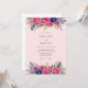 This design features a lush arrangement of watercolor peonies and roses in vibrant shades of hot pink and magenta. Deep navy blue blossoms and soft green foliage create a striking contrast against the pale pink backdrop. The romantic aesthetic is perfect for a spirited event filled with bright botanical elegance.